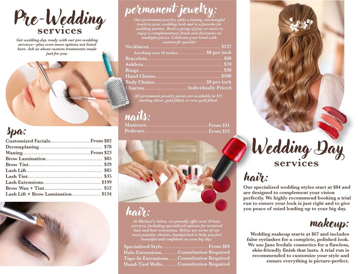 At Michael's Salon and Spa, we believe everyone deserves to feel radiant, confident, and pampered on their big day. From flawless hair and makeup to elegant nails and sentimental permanent jewelry, our wedding services are designed to make you feel your best, from "yes" to "I do."